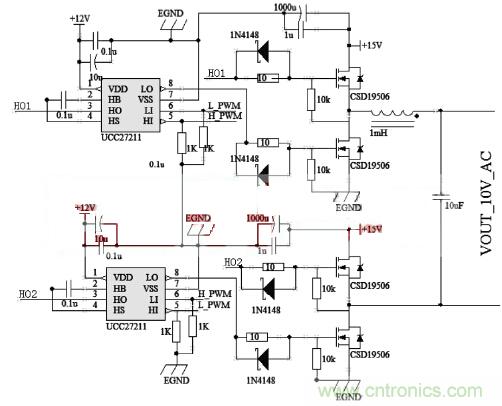 全橋逆變和LC濾波電路如圖2所示。L_PWM和H_PWM由43O單片機產生經過6N137隔離進入MOS驅動芯片UCC27211驅動全橋,後級LC濾波器的截止頻率為