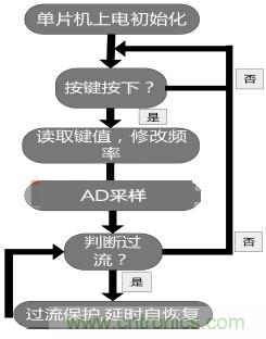 軟件結構框圖如圖1,主程序框圖如圖3。程序執行的流程如下所述:單片機上電之後,係統進行按鍵、片上ADC12和LCD顯示屏初始化,程序查詢按鍵,若有相應按鍵按下,修改正弦波頻率,然後AD采樣電流判斷是否過流;否則返回繼續查詢按鍵。如果輸出過流,程序將關閉SPWM輸出,延時自恢複;否則返回按鍵查詢。