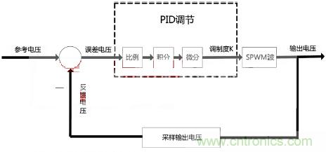 由you於yu輸shu入ru電dian壓ya隨sui著zhe負fu載zai變bian大da會hui有you降jiang低di,切qie係xi統tong濾lv波bo電dian感gan具ju有you電dian阻zu成cheng分fen,這zhe些xie因yin素su導dao致zhi在zai係xi統tong開kai環huan下xia負fu載zai調tiao整zheng率lv較jiao大da,因yin此ci本ben係xi統tong采cai用yong閉bi環huan反fan饋kui調tiao整zheng輸shu出chu電dian壓ya穩wen定ding在zai10V。我們選用經典PID反饋調整,對輸出電壓進行采樣,與參考電壓比較得到誤差電壓後進行位移式PID調節,PID運算輸出作為SPWM的調製度K,與正弦波表相乘後形成新的波表進行生成SPWM波運算。用此方法後負載調整率降到了1%以下,圖5是反饋過程框圖。