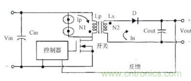 反激開關電源的工作原理可概括為:功率管開啟時,變壓器隻存儲能量,不對次級提供能量;關斷後,變壓器將能量向次級釋放,電路拓撲如圖1所示。它具有電路簡單(節省一個大電感)、不怕負載短路等優點,但由於鐵芯處於單向磁化狀態,為防止磁飽和,需要大鐵芯,也就意味著大體積,故廣泛應用於100—150W的中小功率開關電源。