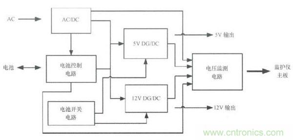 某監護儀的電源部分整體功能框圖見圖2,電源各模塊的功能和關係如下。