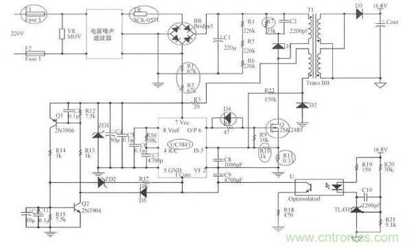 由於大部分電源故障發生在16.8 V前級輸出,故下文選取AC/DC模塊進行分析,圖3為結合實物電路板逆向繪出的電路原理圖。結合本文上麵內容介紹,可以得出結論:本模塊采用了以UC3843芯片為核心的隔離型反激開關電源結構。