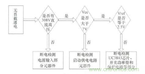 檢修電源首先要檢查在斷電狀態下有無明顯的短路、元器件損壞故障。打開電源的外殼,檢查保險絲是否熔斷,再觀察電源的內部情況,如果發現電源部分的元件破裂,則應重點檢査此元件,一般來講這是出現故障的主要原因,嗅一下電源內部是否有糊味,檢查是否有燒焦的兀器件,問一下電源損壞的經過,這一點對於維修任何設備都是必需的。在初步檢査以後,還要對電源進行更深人的檢測,具體步驟可參考圖4。