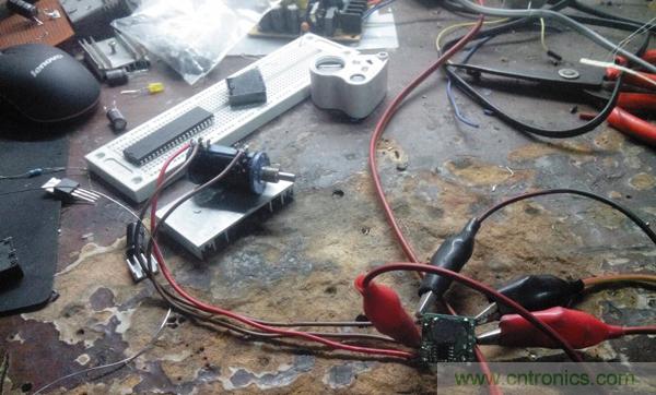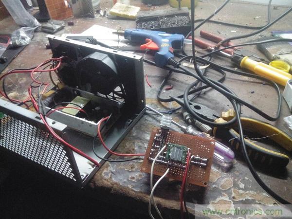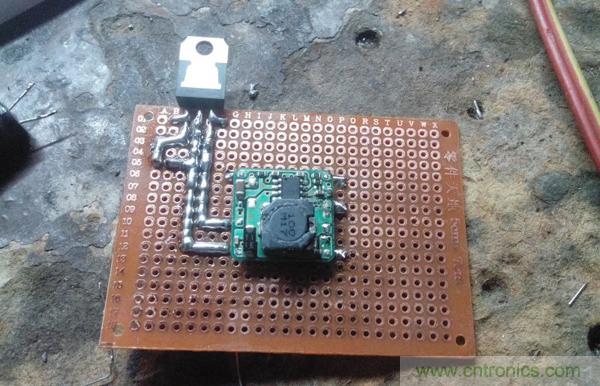 這會算是總裝前測試了,兩根白色線是模塊的軟啟動線,模塊控製腳通過100k電阻到Vcc,所以懸空都能使模塊工作,要讓它停止輸出,直接接地就好了,所以兩根線怎麼接,甭說了吧,都懂得。
