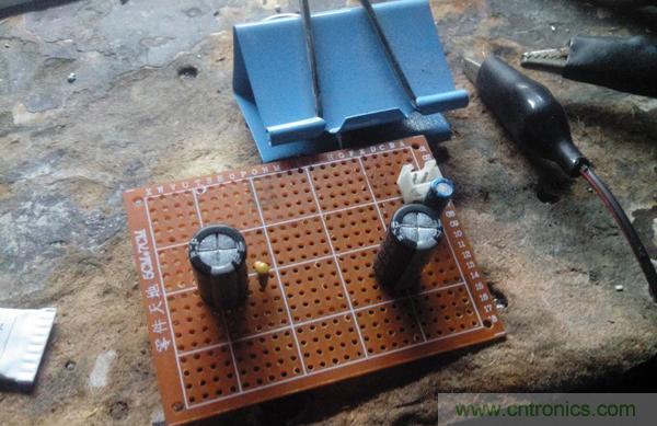 輸入輸出濾波電容以及穩壓塊輸出插座焊接好,也有一隻220uF的小電容做濾波,藍色燕尾夾是固定穩壓塊和散熱片,用的導熱膠粘上去,發現要是完全固化了,摳都摳不下來。