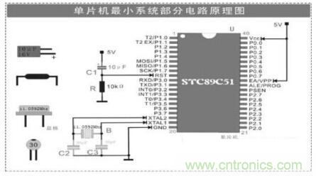 STC89C51使用11.0592MHz的晶體振蕩器作為振蕩源,由於單片機內部帶有振蕩電路,所以外部隻要連接一個晶振和兩個電容即可,電容容量一般在15pF至50pF之間。