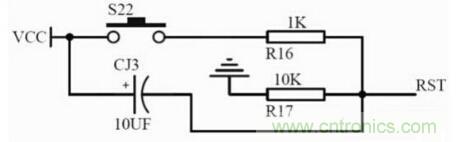 (2)按鍵複位:按鍵複位就是在複位電容上並聯一個開關,當開關按下時電容被放電、RST也被拉到高電平,而且由於電容的充電,會保持一段時間的高電平來使單片機複位。