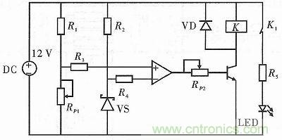 合he理li的de蓄xu電dian池chi充chong放fang電dian,不bu僅jin可ke以yi延yan長chang蓄xu電dian池chi壽shou命ming,且qie能neng提ti升sheng整zheng個ge電dian路lu係xi統tong的de穩wen定ding性xing。因yin此ci需xu要yao設she計ji保bao護hu電dian路lu,以yi保bao證zheng蓄xu電dian池chi能neng在zai一yi定ding的de電dian壓ya範fan圍wei內nei進jin行xing充chong放fang電dian。本ben項xiang目mu使shi用yong3級級聯的12 V鉛酸蓄電池。由於過充電路與過放電路有相似性,本文隻給出蓄電池的過放電路,如圖5所示。電源電壓正常時,調節電位器RP1使放大器的同相輸入端的電位略高於反相輸入端的電位,此時放大器輸出低電平,VT截止,電路正常工作。當電源電壓<10.5 V時,反相輸入端的電位大於同相輸入端的電位,放大器會輸出高電平,調節RP2,使VT導通,此時負載與電源斷開。