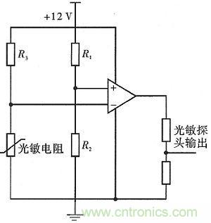 其(qi)由(you)光(guang)電(dian)轉(zhuan)換(huan)模(mo)塊(kuai)和(he)光(guang)敏(min)電(dian)阻(zu)組(zu)成(cheng)。光(guang)電(dian)轉(zhuan)換(huan)由(you)比(bi)較(jiao)器(qi)來(lai)實(shi)現(xian)。當(dang)光(guang)敏(min)探(tan)頭(tou)感(gan)應(ying)的(de)光(guang)照(zhao)強(qiang)度(du)不(bu)強(qiang)時(shi),比(bi)較(jiao)器(qi)會(hui)輸(shu)出(chu)高(gao)電(dian)位(wei),否(fou)則(ze)輸(shu)出(chu)低(di)電(dian)位(wei)。具(ju)體(ti)電(dian)路(lu)如(ru)圖(tu)6所示。R1分擔電路電壓,依照外界環境條件,選擇適當的電阻R2,控製比較器中正相輸入的電壓值,使其作為比較器工作的參考電壓;R3qidaobaohuguangmindianzuyijifenyadezuoyong。guangmindianzudezuzhisuizhewaijieguangqiangdebianhuaerbianhua,zheyangjiukejiangguangxinhaobianhuanchengdianyaxinhao,yicizuoweixinhaodianyalianjiedaobijiaoqidefanxiangshuruduan。bijiaolianggeshuruduandedianyadaxiao。ruoxinhaodianyajiaoxiao,bijiaoqishuchugaodianping,fouzebijiaoqishuchudidianping。congershixianzaimingliangtiaojianxiashuchudidianping,zaiheiantiaojianxiashuchugaodianpingdeshejiyaoqiu。
