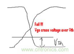 下麵這種情況有非常多的人會忽視,甚至是一些比較有經驗的電源測試工程師。下麵組圖四是下管打開,上管關閉時候的波形(圖4-1是示意圖,圖4-2示實際測試圖)。雖然沒有被同時帶起的情況,但是請注意上下管有交叉的現象,而且交叉點的電平遠高於MOS管規定的Vth值,這是個嚴重的shoot through現象。最直接的後果就是MOS管燒毀!
