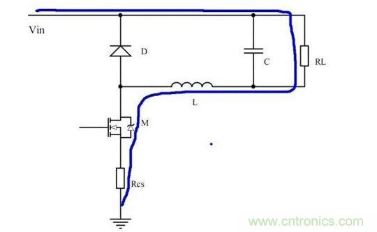 接下來的開關周期內,電感通過二極管D續流,如圖3所示。這就出現了一個問題,此時的電流不再流經開關管,控製電路無法知道電流下降到何種程度了。