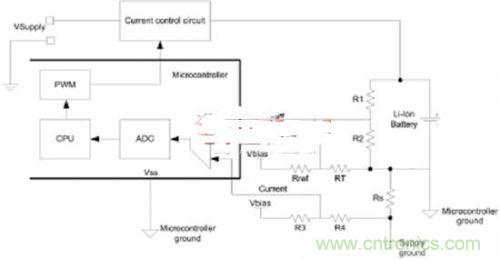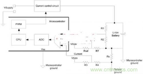 電池負端可作為微控製器接地,這就讓電壓、溫度和電流反饋可參考微控製器接地,並能進行單端ADC測量。對於電流反饋而言,正偏移電壓需要引入,而反饋電壓在電池充電時將為負。如圖5所示,電阻R3和R4提供了所需的偏移電壓。