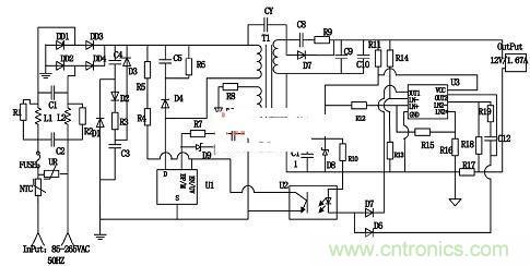 電源的核心部分采用反激式變換器,結構簡單,易於實現。整體設計電路圖如圖1.