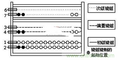 圖3:變壓的初級、次級和偏置繞組的繞製示意圖