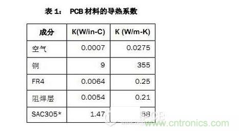 該PCB主要由FR4電路板材料和銅組成,另有少量焊料、鎳和金。表1列出了主要材料的導熱係數。
