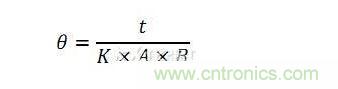 變量l是通孔的長度(從頂麵銅層到底麵銅層)。電路板上焊接電源模塊的地方沒有阻焊層,但對其他區域,PCB設計工程師可能要求在每個通孔的頂部放置阻焊層,否則通孔上麵的區域會空缺。由於通孔隻連接外銅層,所以其長度為63.4密耳(0.0634英寸)。總通孔長度本身的熱阻是167°C/W,如式3所示。