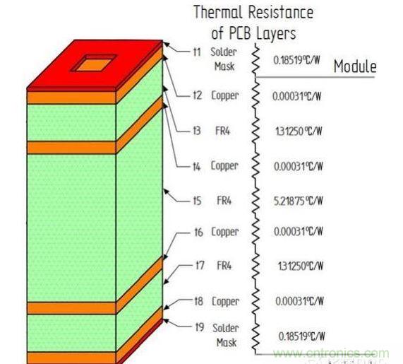 請注意,這些值隻是一個通孔本身的熱阻,並未考慮穿過電路板的每一段與圍繞它的材料是橫向連接的。