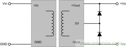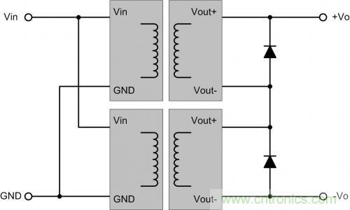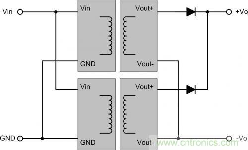 如一個5V轉±12V的電源,若臨時需要5V轉24V,可把負當地,正輸出當24V電源,輸出24VDC。應用時,在輸出各方向並聯一個二極管續流,防止兩路啟動時間不同,由一路通過負載給另一路的內部電路充電。