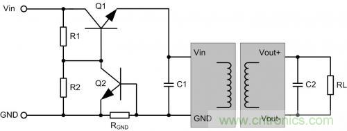 通過檢測RGND的電流,增大Q2的導通電壓後,把Q1關斷,停止供電,達到過流或短路保護的目的。