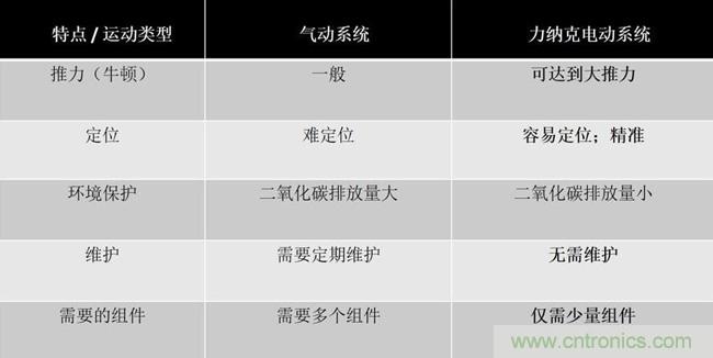 與氣動相比有多種突出優勢,下圖是力納克電動係統和氣動係統進行的簡單比較: