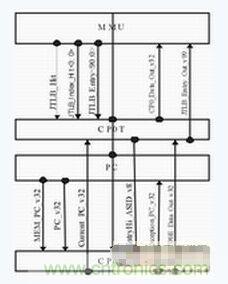 協助TLB進行虛實地址轉換是CP0的主要功能之一。TLB屬於係統的特權資源,隻有CP0有權對其進行訪問,因此CP0與TLB之間的連線較多,數據交換的時延也比較關鍵。同時,PC模塊與CP0的數據交換也非常重要。因此,CP0單元在版圖上最好同時靠近TLB和PC模塊。本設計將CP0中與TLB相關的邏輯與寄存器獨立為CP0T,放在MMU與PC模塊之間;CP0的其餘部分歸為CP0E,放在PC下部,也就是整塊芯片的最下端。如下圖所示。