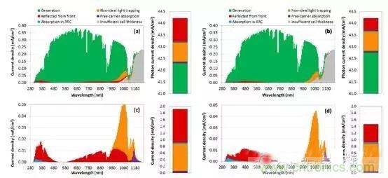 對於晶體矽太陽電池,前表麵的光學特性和複合至關重要。對於IBC高效電池而言,更好的光學損失分析和光學減反設計顯得尤其重要。McIntosh等人采用橢偏儀、量子相應測試與數值模擬相結合的方法,定量的確定了IBC電池的光學損失,包括前表麵發射、減反膜寄生吸收、長波段不完美光陷阱、自由載流子吸收的影響等,如圖3所示。