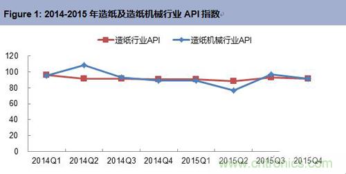 自動化產品在造紙及造紙機械行業的應用十分廣泛,主要的產品類型有傳動係統、控製係統、執行機構和過程控製儀表等。2015年四季度造紙行業自動化產品市場規模為2.32億元,同比下滑8.5%;造紙機械行業自動化產品市場規模為0.41億元,同比下滑8.4%。行業API指數均小於100。受整體經濟環境低迷、產能過剩矛盾、資源整合、行業結構調整等因素影響,且隨著“新環保法”、“水十條”等環保新政的出台和實施,造紙行業新建和改造項目減少,從而使造紙及造紙機械行業自動化產品市場規模萎縮。