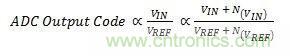 這個影響與ADC的基本任務相關;而ADC的(de)基(ji)本(ben)任(ren)務(wu)就(jiu)是(shi)提(ti)供(gong)一(yi)個(ge)輸(shu)出(chu)代(dai)碼(ma),來(lai)表(biao)示(shi)輸(shu)入(ru)信(xin)號(hao)電(dian)壓(ya)與(yu)基(ji)準(zhun)電(dian)壓(ya)的(de)比(bi)率(lv)。輸(shu)入(ru)和(he)基(ji)準(zhun)電(dian)壓(ya)都(dou)會(hui)將(jiang)一(yi)個(ge)噪(zao)聲(sheng)項(xiang)添(tian)加(jia)到(dao)這(zhe)個(ge)比(bi)率(lv)中(zhong),如(ru)方(fang)程(cheng)式(shi)1所示: