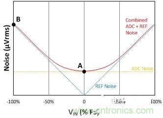當通過使用均方根增加的方法將基準噪聲添加到ADC的噪聲中時,這個組合噪聲是輸入電壓的函數,它會在正或負輸入電壓變大時增加。在圖2中的曲線上,有幾個點需要注意: