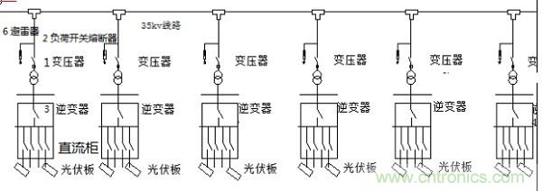 所以根據光伏發電負荷的特性,采取高壓35KV深入方陣內部,采用小容量100KVA變壓器升壓,完全可以做到線損率最低,提高發電效率的目的。