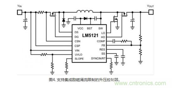 第三個保護選項是一個具有集成湧入限製控製的升壓控製器。這個方法仍然需要將一個附加的MOSFET用作保護器件,因為升壓的高端元件(一個續流二極管或同步MOSFET)無法反向。然而,如圖4所示,與熱插拔控製器方法相比,將升壓和保護控製集成在一個IC中有助於降低解決方案複雜度和尺寸,同時也提供了很多其它保護特性。