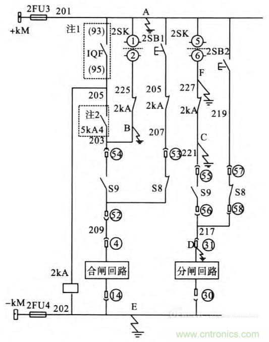 如上圖所示,直流接地故障發生在C、E兩點,D、E兩點,F、E兩點接地時,分閘線圈被短接,保護動作及操作時開關拒跳。同理,兩點接地開關也可能合不上,如B、E兩點接地時。