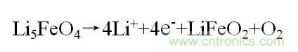 在這個過程中,大部分的鋰離子都無法可逆的再次嵌入到LiFeO2中,但是這些鋰離子可以用於抵消負極帶來的不可逆容量損失。因此在使用中我們隻需要在正極材料中加入少量的Li5FeO4即可。