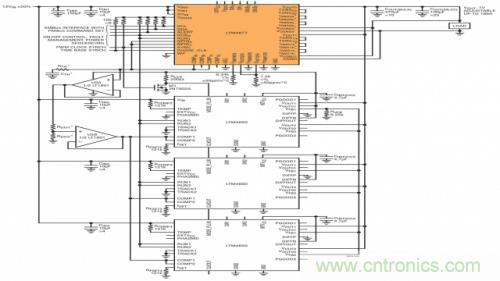 µModule DC/DC 穩壓器可提供一種同時提供高功率輸出和 DPSM 功能的簡單和有效之方法。由於可容易地通過並聯多個 µModule 穩壓器以提供高電流輸出 (各個通道彼此之間的電流匹配準確度標稱值在 1% 以內),從而降低了產生熱點的可能性。而且,隻有其中一個 µModule 穩壓器必需具備 DPSM 能力,原因是即使並聯的 µModule 未內置固有的 DPSM,它也能提供完整的數字接口。圖 2 示出了一個 LTM4677 (36A DPSM µModule) 與 3 個 LTM4650 (50A µModule) 相並聯的應用電路原理圖。