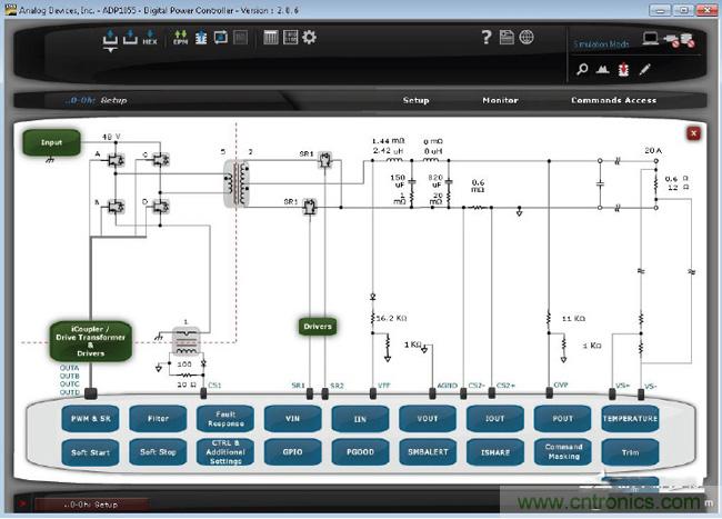 圖形用戶界麵(GUI)是這種困境的一種解決方案。因為GUI可簡化數字電源的編程。許多數字控製器IC供應商均提供GUI。通常,GUI的設計方式能夠使電源專家直觀地使用它們。圖1顯示了這樣的圖形用戶界麵。您可用鼠標選擇電源的不同方麵,在屏幕上的不同功能框圖中進行不同的設置。