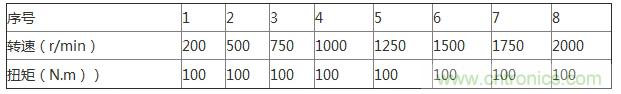 加載電機在轉速控製模式下,從0慢慢提高給定轉速0-200r/min.轉速穩定後,在扭矩模式下,從0慢慢提高給定扭矩1-100Nm,隨後再逐次上升轉速: