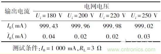 電源穩定度測試數據如表1 所示。其中電源穩定度是指在容許電網波動範圍條件下,對輸出電流穩定度的影響。測試條件為I0 =1 000 mA,RL =3Ω,測試數據表明電網電壓在180 V ~250 V 波動時,輸出電流最大偏差為0.99 mA,紋波電流小於0.05 mA,輸出電流和紋波電流均達到設計要求。