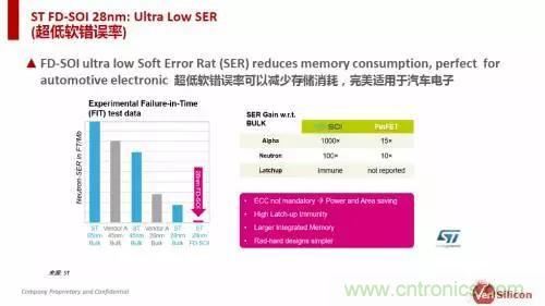 除了低功耗與低成本,FD-SOI工藝在可靠性上也表現出色。沈磊指出,從意法半導體給出的數據來看,由於FD-SOI工藝的敏感體積更小,對閂鎖效應(latch-up)免疫,具備更低的SRAM軟錯誤率,以及更好的電磁兼容性,使其更適用於高可靠應用領域,例如汽車、銀行與生命維持係統等。