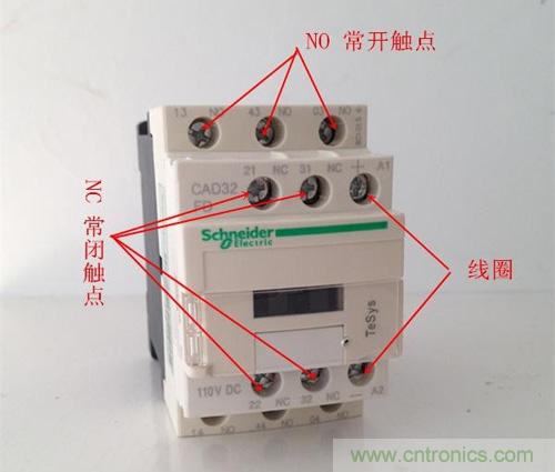 上圖是接觸器,繼電器與之相比較小,但原理相同。共有兩排共12個接線柱(2個接線柱,一進一出算1組)。最上麵一排接線柱中,有2組常閉觸點,和1組線圈觸點,下麵一排有3組常開觸點。