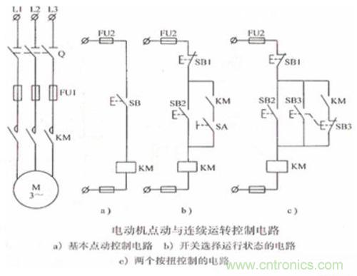 在圖c中,沒有斷路器,取而代之的是一個機械互鎖開關SB3。當按下按鈕SB2時,接觸器線圈通電,常開觸點KM閉合,電動機啟動,鬆開後,由於常開觸點依然閉合,因此電動機正常運轉。按下按鈕SB3時,接觸器常開觸點下方的按鈕常閉觸點SB3斷開,同時按鈕SB3常開觸點閉合,電動機啟動,鬆開後電動機停止(接觸器常開觸點此時未接入電路)。因此,此電路可在電動機連動的時候,直接按下SB3,變成點動。
