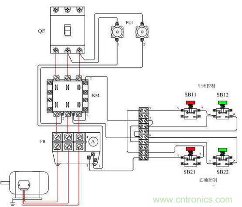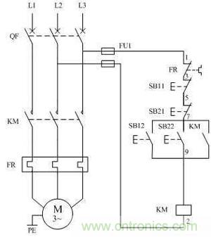 異地控製電動機時,隻需要注意,停止按鈕全部串聯,啟動按鈕全部並聯即可。