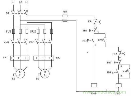 其中,按鈕SB1和SB3是停止按鈕,分別控製電動機M1與M2;按鈕SB2和SB4是啟動按鈕,分別控製電動機M1與M2。為了方便理解,我把電路圖中M2的控製回路突出來一塊,即當下文提到M2的控製回路時,指的就是上圖中最右側突出來的那一塊。