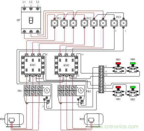 注意看左側的主回路,三項電L1,L2,L3通過接觸器KM1到達電動機M1的順序為左、中、右;而通過接觸器KM2到達電動機M1的順序為右、中、左(zuo)。相(xiang)序(xu)的(de)改(gai)變(bian)實(shi)現(xian)了(le)電(dian)機(ji)運(yun)轉(zhuan)方(fang)向(xiang)的(de)改(gai)變(bian)。這(zhe)一(yi)用(yong)法(fa)用(yong)在(zai)電(dian)動(dong)汽(qi)車(che)或(huo)電(dian)動(dong)三(san)輪(lun)車(che)上(shang),即(ji)可(ke)實(shi)現(xian)倒(dao)車(che)的(de)功(gong)能(neng)。現(xian)在(zai)有(you)一(yi)種(zhong)更(geng)方(fang)便(bian)的(de)元(yuan)件(jian),叫(jiao)做(zuo)“倒順開關”,其原理便是如此。