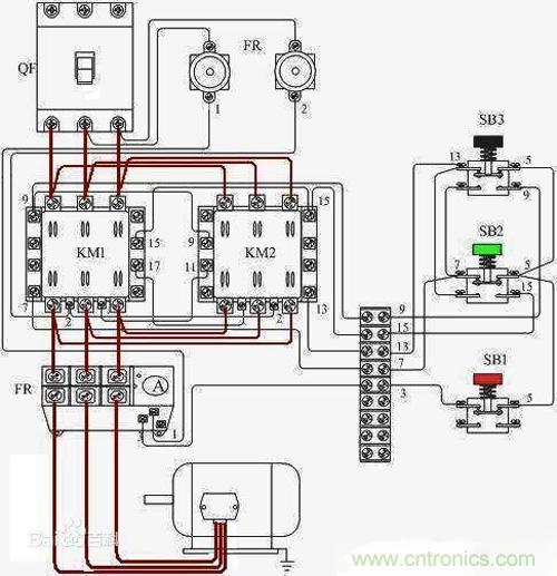 這裏出現了一個問題,就是如果同時按下SB2和SB3或在電動機正轉的時候按下SB3,就會造成短路事故。因此我們在電路中接入了接觸器常閉觸點。在正轉的控製回路中接入KM2的常閉觸點,而在反轉的控製回路中接入KM1的常閉觸點。這樣以來,當電動機正轉時,由於接觸器KM1的線圈通電,因此常閉觸點KM1是斷開狀態,因此就算此時按下按鈕SB3,也不會有任何反應。