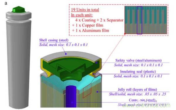 由於在動力電池組中18650電池一般是采用垂直裝配的,在電池組發生跌落等情況下,軸向擠壓是造成鋰離子電池變形的主要原因,因此Juner Zhu主zhu要yao研yan究jiu了le在zai軸zhou向xiang壓ya力li下xia電dian池chi變bian形xing導dao致zhi鋰li離li子zi電dian池chi短duan路lu的de機ji理li。一yi些xie傳chuan統tong的de模mo型xing由you於yu假jia設she鋰li離li子zi電dian池chi內nei部bu是shi一yi個ge均jun一yi的de整zheng體ti,因yin此ci在zai預yu測ce18650dianchizhouxiangyasuoshiyandeshihoujiuwufazhunqueyuceshiyanjieguo,zhezhuyaoshiyouyulilizidianchidianxindeteshujiegou,daozhizaidianxindeshangbuhexiabubingbuwanquanyizhi,tongshiyouyulilizidianchishanggai(也就是正極)獨特的結構使得鋰離子電池在承受軸向壓力的時候,可能會在內短路發生之前,就引起鋰離子電池發生短路。