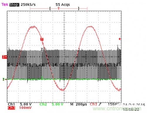 直列式電流感應方法看似是最合理的,因為這是最終要測量的電流。但這種方法存在一個問題。驅動MOSFET或IGBT的PWM信(xin)號(hao)對(dui)電(dian)流(liu)感(gan)應(ying)放(fang)大(da)器(qi)造(zao)成(cheng)嚴(yan)重(zhong)破(po)壞(huai)。感(gan)測(ce)電(dian)阻(zu)處(chu)的(de)共(gong)模(mo)信(xin)號(hao)從(cong)電(dian)源(yuan)電(dian)壓(ya)被(bei)驅(qu)動(dong)到(dao)接(jie)地(di),具(ju)有(you)非(fei)常(chang)快(kuai)速(su)的(de)瞬(shun)態(tai)開(kai)關(guan)特(te)性(xing),而(er)電(dian)流(liu)感(gan)應(ying)放(fang)大(da)器(qi)試(shi)圖(tu)測(ce)量(liang)感(gan)測(ce)電(dian)阻(zu)本(ben)身(shen)的(de)小(xiao)差(cha)分(fen)信(xin)號(hao)。圖(tu)2是由PWM逆變器產生的正弦相電流(紅色波形)的示波器截圖。這種情況下,PWM頻率為100兆赫(MHz),由LMG5200 GaN半橋功率級提供(更多詳細信息,請參見底部的TI設計)。需(xu)要(yao)注(zhu)意(yi)的(de)是(shi),快(kuai)速(su)開(kai)關(guan)信(xin)號(hao)是(shi)直(zhi)列(lie)式(shi)電(dian)流(liu)感(gan)應(ying)放(fang)大(da)器(qi)測(ce)量(liang)相(xiang)電(dian)流(liu)時(shi)所(suo)接(jie)收(shou)的(de)信(xin)號(hao)。這(zhe)就(jiu)像(xiang)在(zai)有(you)颶(ju)風(feng)的(de)情(qing)況(kuang)下(xia),當(dang)杯(bei)子(zi)在(zai)海(hai)上(shang)漂(piao)浮(fu),而(er)試(shi)圖(tu)測(ce)量(liang)杯(bei)中(zhong)液(ye)體(ti)一(yi)樣(yang)。難(nan)怪(guai)大(da)多(duo)數(shu)設(she)計(ji)師(shi)會(hui)考(kao)慮(lv)使(shi)用(yong)低(di)側(ce)感(gan)應(ying)!下麵我們將介紹另外一種方法。