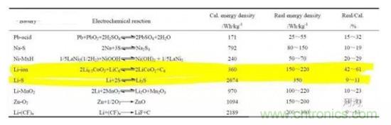 CRABTREE 2015年在The energy-storage frontier : Lithium-ion batteries and beyond中總結了過去25年鬆下18650電芯能量密度的變化。經過千辛萬苦,現在電芯實際R占比(Real/Cal.)已經達到了61%左右,實際電池係統加上管理係統、冷卻係統、引線等,成組實際能量密度會更進一步降低。下表例舉了一部分現有實際電池能量密度,可憐的明日之星鋰硫電池才10%左右的理論容量發揮;按照R max = 61%算,理論能量密度最高的鋰空的能量密度大概為3182 Wh/kg。
