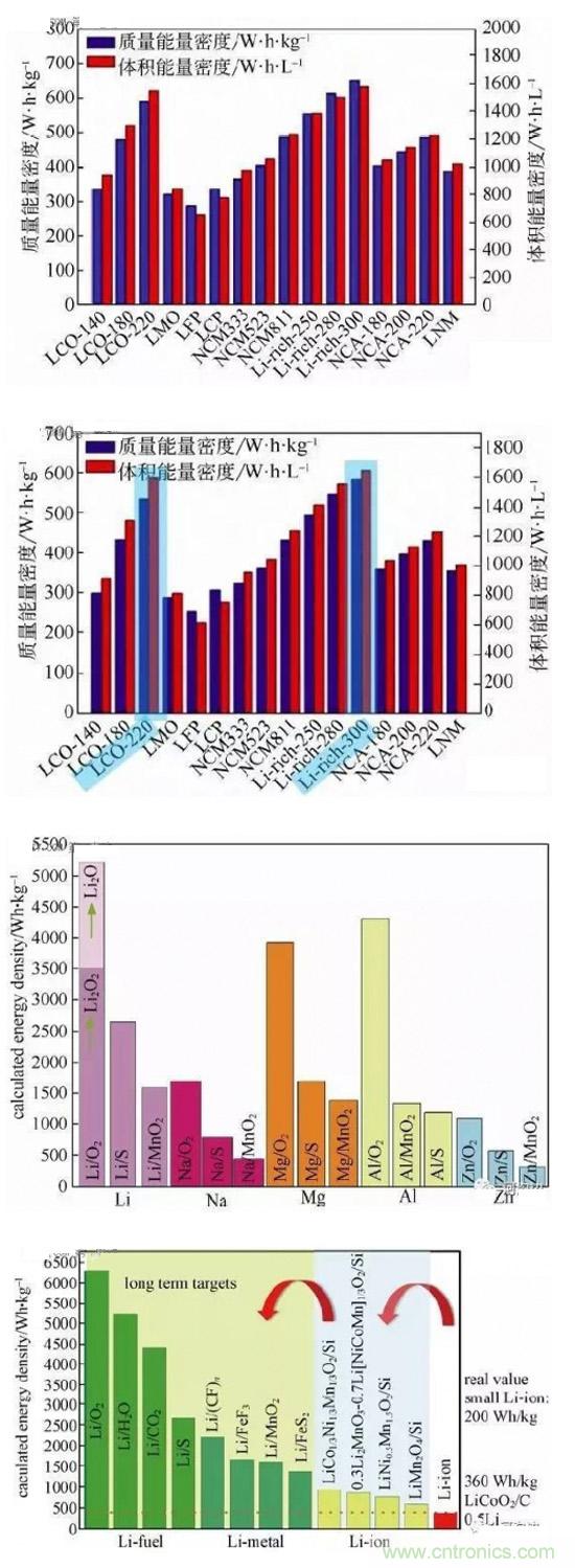 中科院的吳嬌楊博士對於選取了現有理論容量較高、理論容量較低但是商業化比較成熟等綜合性能比較好的正負極材料,進行正負極搭配,大致得出了結果:Li-rich-300 對Si-C-2000 的電芯體係,在所有的電池體係中具有最高質量能能量密度584 W·h/kg以及最高體積能量密度1645 W·h/L。該數值不包括封裝材料與極耳。