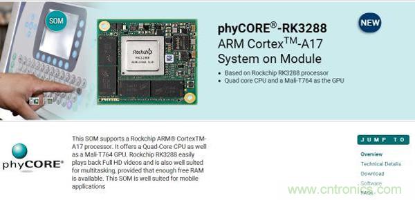 國際知名的處理器及電子技術型公司Phytec,推出了phyCORE-RK3288 ARM CortexTM-A17 System on Module,采用RK3288 SOM做工控板。根據Phytec網站資料描述,瑞芯微RK3288 CPU以及GPU性能強大,可輕鬆應對全高清視頻與多任務,非常適用於移動應用。