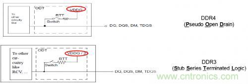 驅動DRAM工業發展的一個主要市場需求是對內存器件的低功耗要求。介於這個原因,DDR4引入了一個新的IO驅動標準,成為PSOD(Pseudo Open Drain)。在PSOD裏,接收端將信號端接到軌電壓(VDD),而不是軌電壓的一半(VDD/2)。